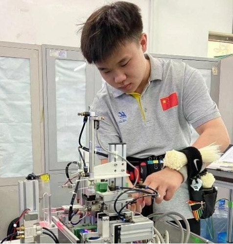 郑泽鑫是19级机电一体化专业的学生,郑永壕是19级自动化专业的学生,他们的成绩均在班里名列前茅。两个姓氏相同、年龄相仿的少年,在进入机电一体化竞赛集训队之前,都对机械充满了兴趣,经常喜欢把各种工具和设备大卸八块后重新进行组装,对技术有着火热的追求。两人不约而同地报名了机电一体化竞赛集训队,他们是搭档,也曾是对手,经过了多轮比拼和选拔,他们相互促进,形成了队友默契,最终他们通过机械行业选拔赛成为第二届全国技能大赛“机电一体化”赛项的参赛选手。自此,他们一心扑在竞赛训练上,不仅熟练竞赛设备的操作,而且从基础开始慢慢储备自动化控制、PLC编程、机械装备和传感器调试等方面的知识,深入分析赛程和技术文件,不断钻研赛项竞赛内容和任务难点,不断模拟赛场上可能出现的问题和设备故障解决方案。通过不懈的努力,他们知识储备深厚,技能操作熟练,遇到难题也能逐一排查并解决,信心倍增。正式比赛开始后,他们顶住压力、克服疲惫、沉稳发挥,配合默契最终获得了银牌。经过这次比赛,他们更加懂得队友的默契配合是成功的必备因素。他们表示:“技术的发展永无止境,我们也将继续努力,保持竞争力和对技术的热衷,为下一次比赛做准备。”