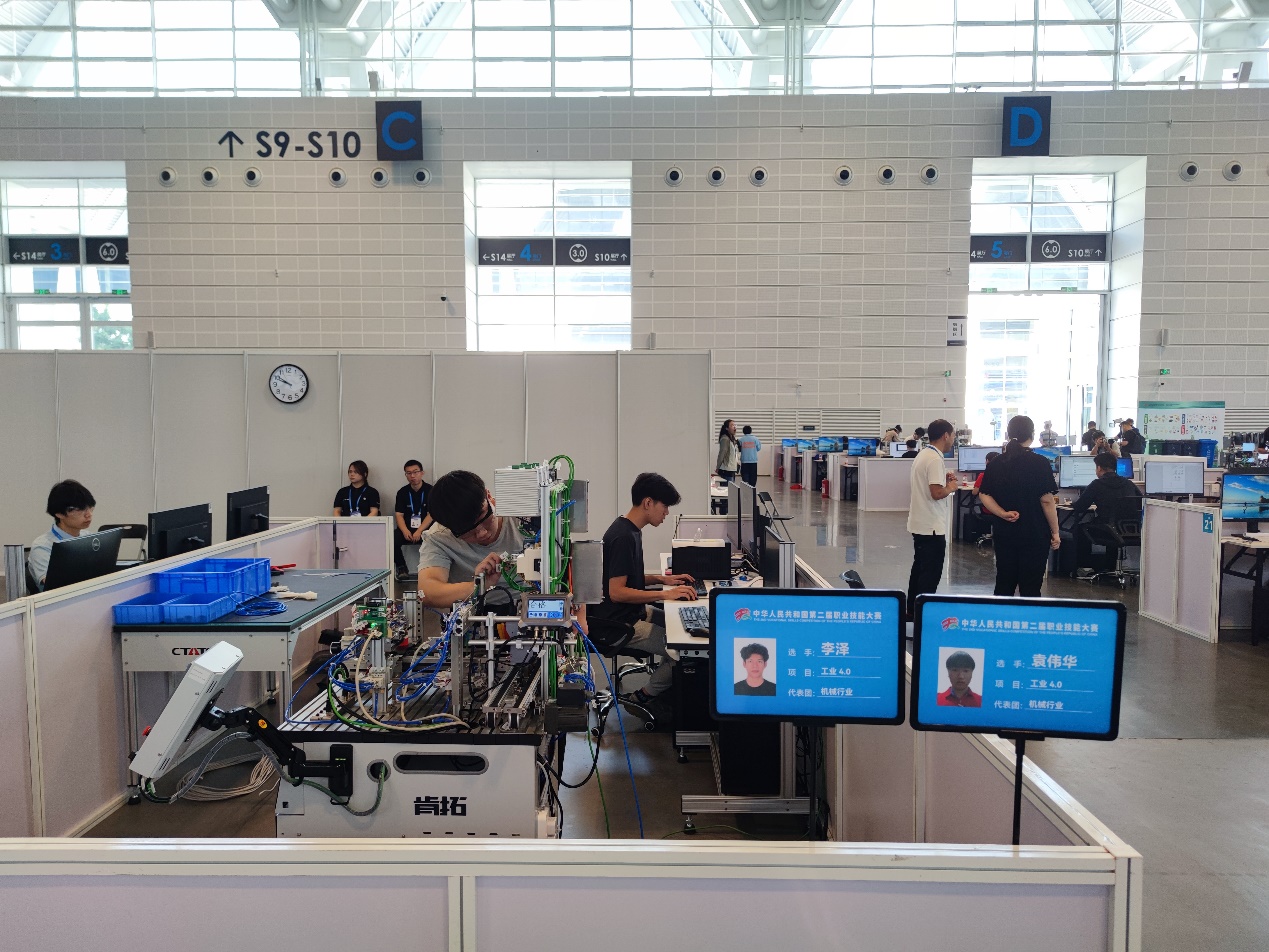 刘富强于2017年9月入读广州市机电技师学院,凭借着对学习技能的执着和追求,他经过层层选拔加入了机器人系统集成项目竞赛集训队。进入集训队后,他一直勤于学习,积极进取,刻苦钻研技能,全身心投入训练和比赛。因为对技能执着的追求,他成为了留队最久的选手,也蜕变为学院的教师,期间斩获不少佳绩,积攒大量竞赛经验。周玮于2019年9月入读广州市机电技师学院,是班里的优秀学生,在班主任的引导下他申请加入了机器人系统集成项目竞赛集训队,入队后他进步很快并对机器人系统集成项目产生了浓厚兴趣。经过一轮又一轮的严格考核,他逐渐脱颖而出,从三梯队晋升到二梯队,再到一梯队,学习的越是深入,他发现自己越是不足,他便付出加倍的努力,最终和刘富强成为搭档并代表机械行业队选手参加第二届全国技能大赛。两位选手都十分沉稳细心,面对赛场的各种变化,他们都能积极调整心态、从容应对,这离不开他们日复一日的勤学苦练。斩获第二届全国技能大赛“机器人系统集成”项目的银牌后,两位选手一致表示:“这次的成功只是实现梦想路上的新起点,归零再出发,以饱满的热情投入到后续的技能提升上。”经过世赛集中考核,刘富强成为第47届世界技能大赛机器人系统集成项目中国正选选手。“期待今年能够圆梦法国,身披五星红旗站在世界技能大赛的冠军领奖台,为祖国增光、为人生添彩!”刘富强说。